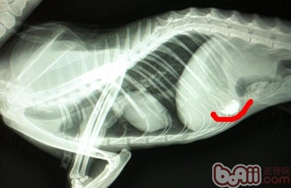 此片攝于患貓灌入鋇餐20小時(shí)后,正常情況下,鋇餐應(yīng)完全通過胃區(qū),通過腸道,應(yīng)幾乎排空,顯然此片中胃區(qū)任有少量殘余液體,腸道內(nèi)幾乎排空,反映出雖然消化道沒有完全堵塞,但胃排空較慢,腸道蠕動(dòng)減慢,因此貓為長毛貓,消瘦,主人常年在外缺乏管理,不能提供足夠的病情資料,與主人溝通后,采取保守治療,通過支持療法和食物緩瀉療法,此貓逐漸排除體內(nèi)伴有大量毛發(fā)的干燥積便。