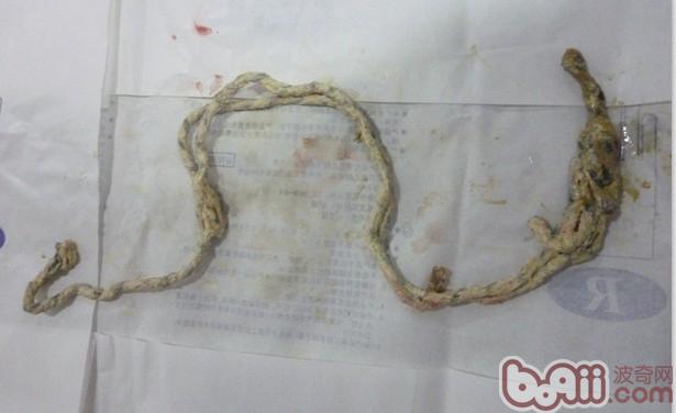 此為上文中提到的貓咪誤食的大閘蟹扎線,看似柔軟,但是這樣的線粗且長,經(jīng)過腸道蠕動(dòng)后更容易在腸道中堵塞,圖片中的線在鋇餐造影以后確定位置,手術(shù)治療,10天后貓咪逐漸恢復(fù)正常。
