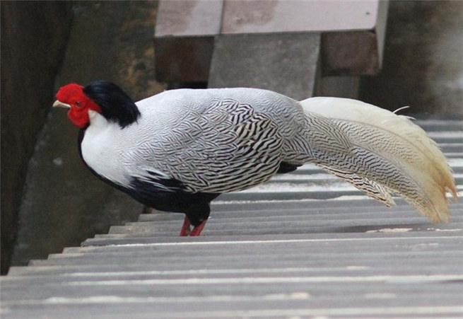 雄鳥:頭上羽冠及下體藍黑色;臉裸露,赤紅色。上體和兩翅白色,自后頸或上背起密布近似‘V’字形的黑紋;黑紋的多寡,粗細以及顯著與否隨亞種而不同。尾甚上,白色,尾的長短、其上有無黑紋、黑紋的多少,亦隨亞種而不同,是亞種的另一鑒別特征之一。 雄鳥羽色不同于其他雉類的絢麗華美,而是一身銀裝素裹。它的頭上具有長而厚密,狀如發絲的黑色羽冠,并披于頭后;臉部裸出,呈鮮紅色;整個下體都是烏黑色;上體和身體后面長長的尾羽,都是潔白的襯底上密布著細細的“V”字形黑紋。尤為別致的是,尾羽上的黑紋越向后越小,逐漸消失。[1]