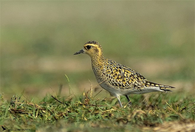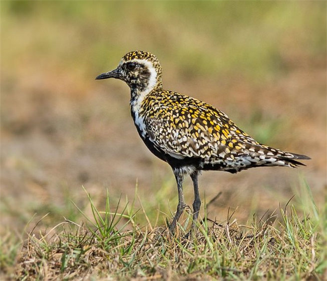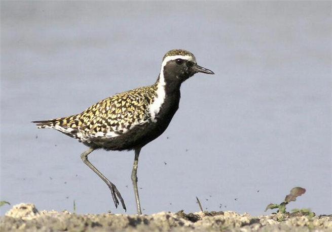 成鳥(繁殖羽):額基棕白,向兩側(cè)與白色眉紋相連;頭、后頸、背至尾上覆羽黑褐色,滿布金黃和淺棕白色點斑,尤以金黃色點斑為濃著;尾羽具黑褐與淡棕白色相間的橫斑;初級和次級飛羽黑褐色;翅上大覆羽黑褐色,羽端綴白;翅上小覆羽和三級飛羽與背同色;頸側(cè)的白色與眉紋貫通,并向下延伸至胸側(cè);頰、頦、喉至下胸和腹部中央黑色;兩脅、肛周羽和尾下覆羽淡棕白色,具黑色及灰褐色雜斑;腋羽褐灰色,羽端綴白;翼下覆羽淺褐色。
